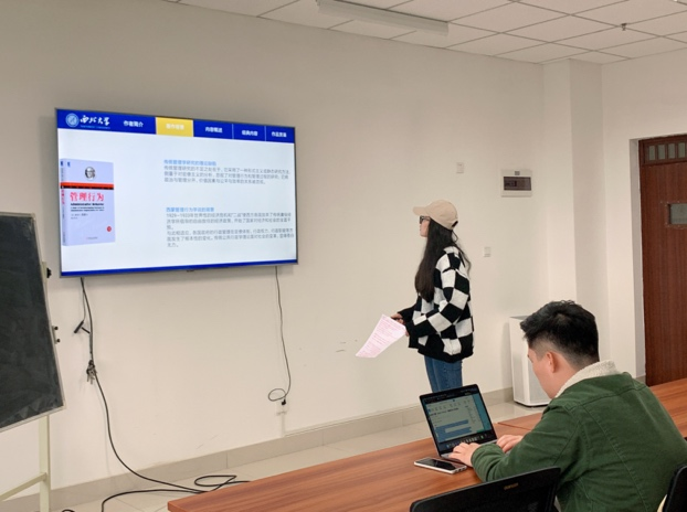 王亚飞同学分享的是赫伯特·西蒙所著的《管理行为》,她从作者简介、著作背景、内容概述、经典内容介绍和作品赏鉴这五个方面展开分享。在汇报时,王亚飞同学着重阐述了这本书的核心第四章和第五章的有限理性决策理论和行政组织理论,最后也对这本书的贡献和不足提出了自己的见解。汇报后,宋兆祥博士对其分享的内容进行点评,宋兆祥博士认为王亚飞同学的汇报条理清晰、内容全面,肯定了她对这本书的整体把握、局限之处的认识以及对我们的启示和反思。