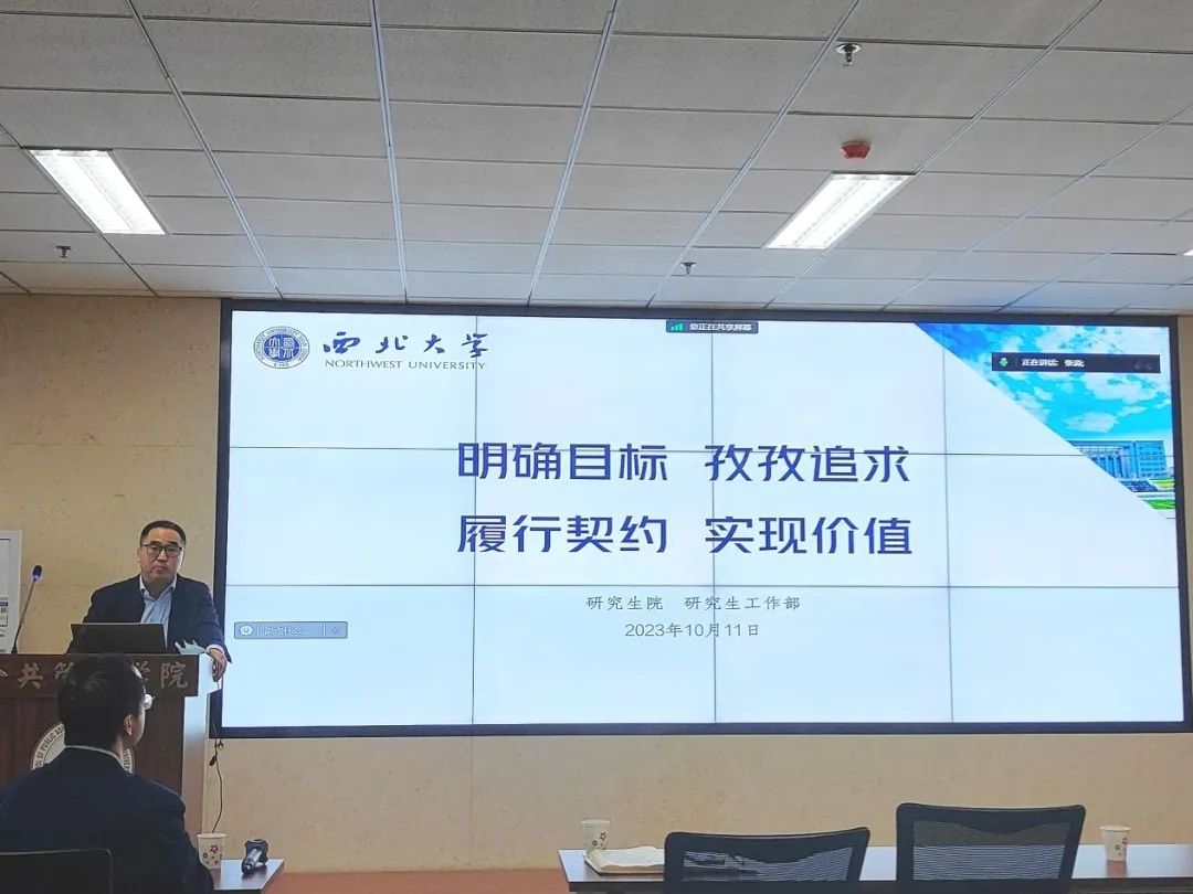 校研究生院副院长冯健涛老师以《明确目标、孜孜追求、履行契约、实现价值》为题,对全体学生就学术规范问题进行了详细说明。针对研究生教育,冯健涛老师梳理了2012年至2022年研究生学术不端行为相关文件,对《西北大学研究生学术不端行为处理办法》、《西北大学研究生学位论文抽检评议结果处理方法》、《西北大学研究生毕业与学位授予分离实施办法》进行了详细说明,并向同学们明确要恪守科研诚信、严禁学术不端行为。