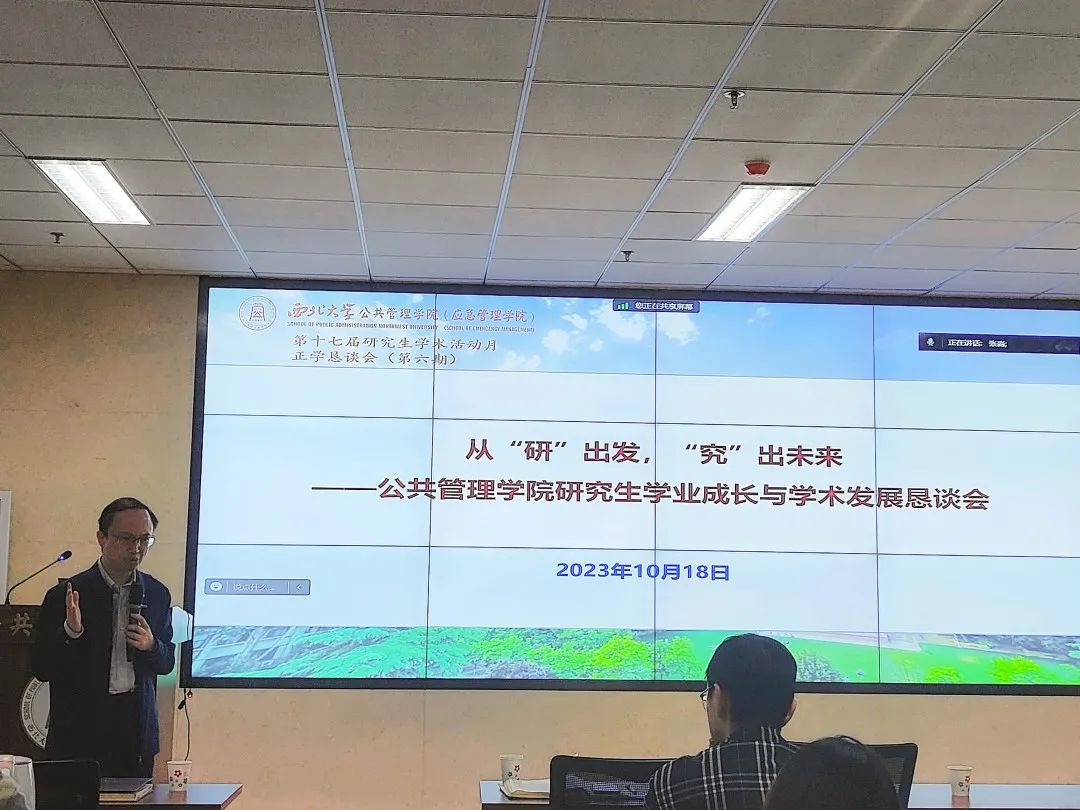 为进一步完善我院研究生教育、教学以及管理工作,促进教师充分了解学生在学术与生活中遇到的问题、想法、意见,并针对学生问题给予相关建议,搭建学生与学校、学生与学院沟通交流的桥梁。2023年10月18日,565net必赢2023至2024学年正学恳谈会(研究生专场)于西学楼1305会议室召开,腾讯会议同步进行线上会议。本次会议以“从‘研’出发,‘究’出未来”为题,校研究生院副院长冯建涛、我院党委副书记韩杰、科研副院长翟绍果、社会保障学系副主任聂建亮、公共政策与管理系主任周文光、人力资源管理系主任刘鹏、公共信息资源管理系主任王铮、学院团委书记陈露、研究生秘书邢莉以及全院博士、硕士研究生参与本次会议,会议由翟绍果教授主持。