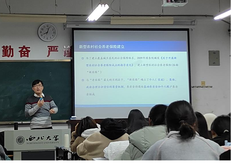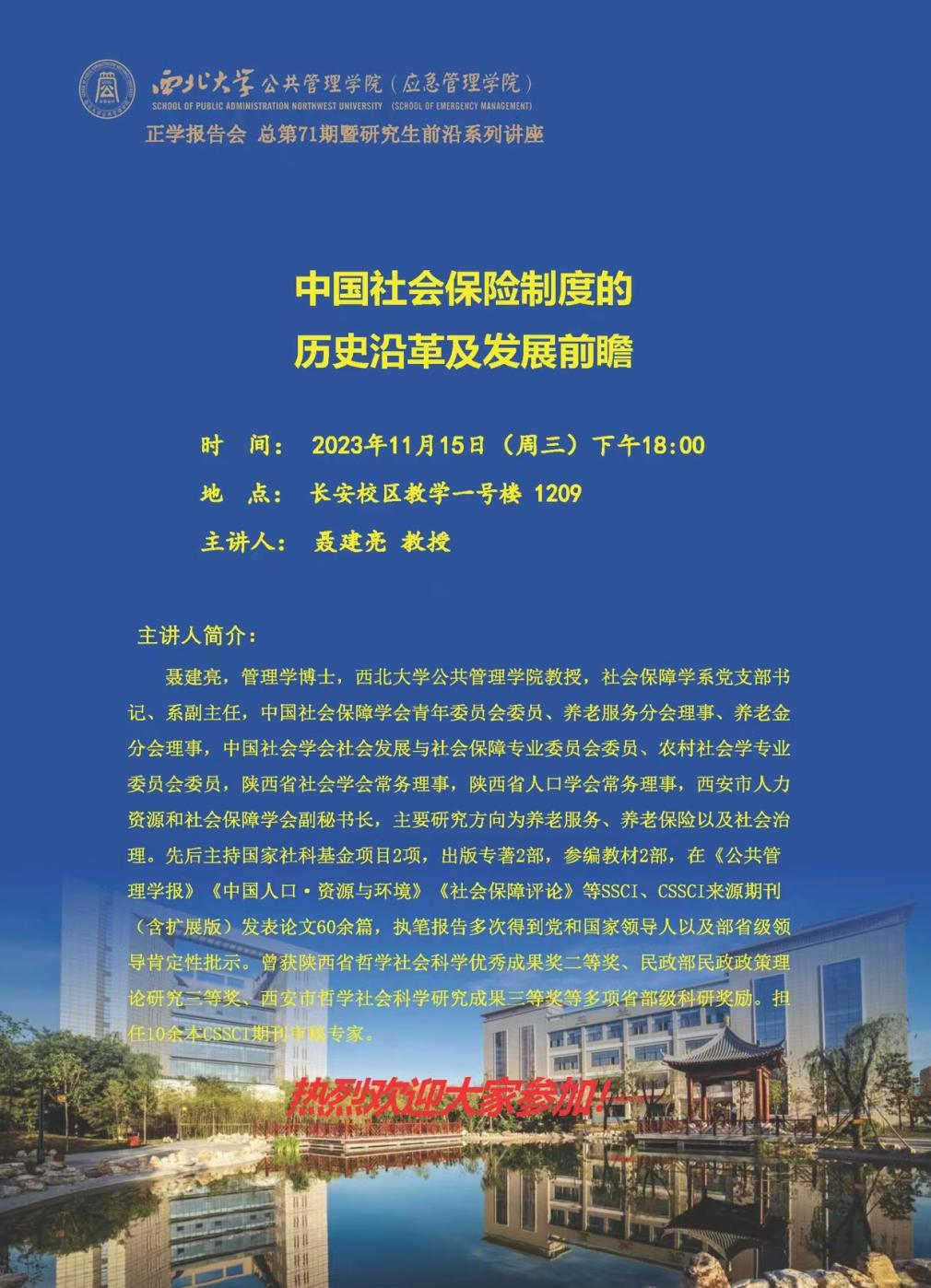 2023年11月15日晚,西北大学565net必赢聂建亮教授在长安校区教学一号楼1209教室为我院2023级全体硕士研究生作了题为“中国社会保险制度的历史沿革及发展前瞻”的专题讲座。