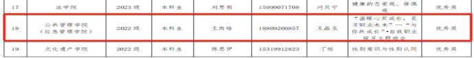 为贯彻落实学校《关于面向全校学生征集“心相遇 爱同行——心理健康教育伴我成长”主题征文的通知》要求,公管院全院学生积极参与“心相遇 爱同行——心理健康教育伴我成长”主题征文活动。征文经院系选拔后参与校内评比,我院亓馨竹同学凭借原创作品《黎光布空,雀默多春》荣获二等奖,我院王琬宁同学凭借原创作品《走出阴霾,遇爱重生》荣获三等奖。