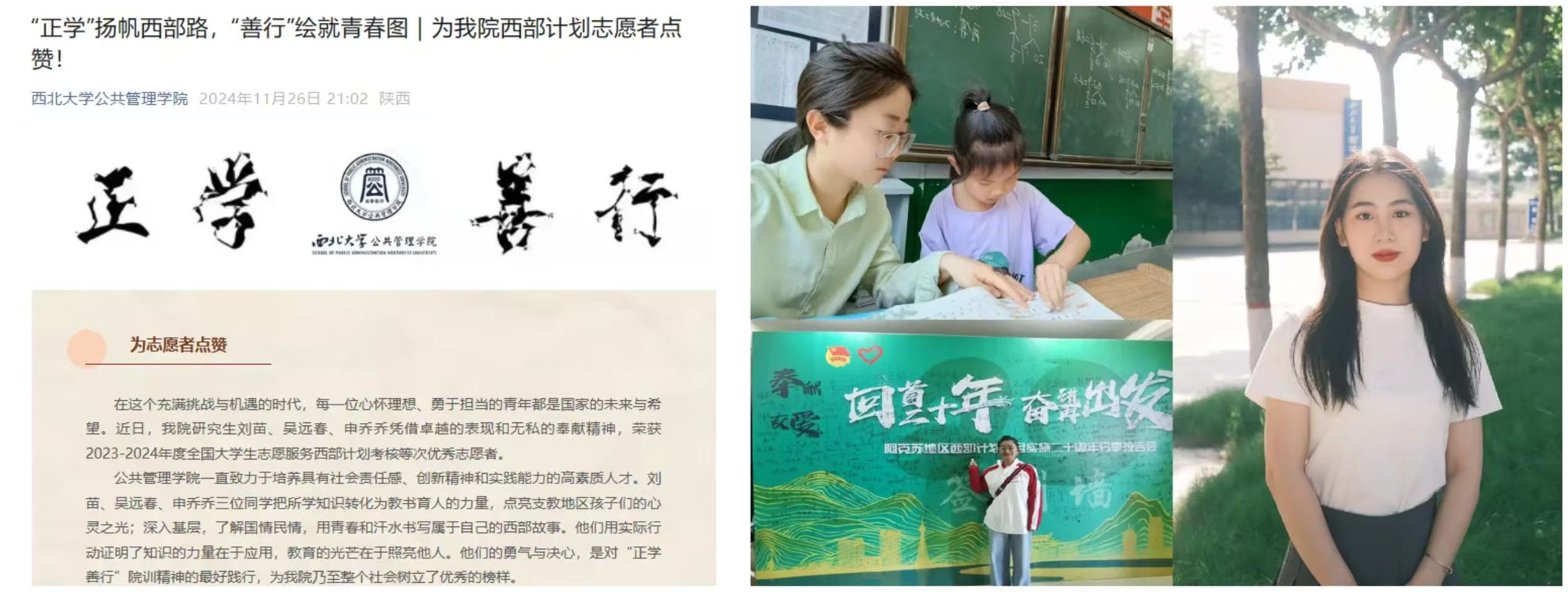 在学院公众号上对我院荣获2023-2024年度全国大学生志愿服务西部计划考核等次优秀志愿者的3名研究生进行专题报道,这些学子们卓越的表现和无私的奉献精神,是对“正学善行”院训精神的最好践行,为学院乃至整个社会树立了优秀的榜样。
