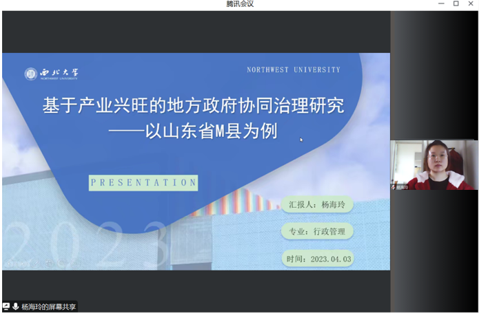 2023年4月3日上午,我院线上举办了2023年第1期研究生专场正学报告会。2020级行政管理专业硕士研究生赵言、张帆帆、李紫瑶、温小雨、杨海玲分别作为主讲人进行专题学术汇报,伍勇副教授担任评议人,部分研究生旁听了此次报告会。