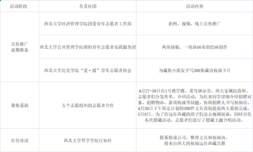 本次爱心捐助活动在西北大学团委青年志愿者工作部青禾志愿服务队的组织下进行,多个院系的志愿服务组织参加了本次活动。
