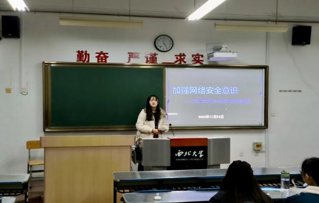 为了加强同学们的网络安全意识,管科二班于11月23日召开了网络安全主题班会,组织委员姜文谦和生活委员杨斯锐讲述了有关网络安全意识的必要性等内容,分享了近期有关违反网络安全条例的案例,让同学们更深刻地了解了网络安全的相关内容。会后,同学们纷纷表示要让网络安全教育警钟长鸣,共创安全网络空间。