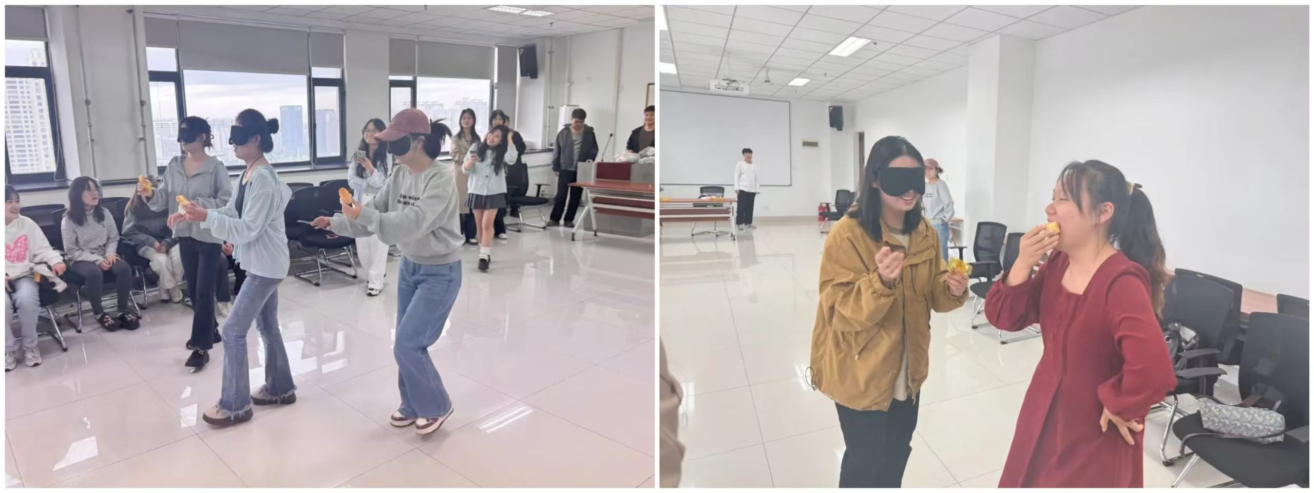 在进一步熟悉彼此之后,接下来进行的“蒙眼喂食”和“七拼八凑”两个游戏都是需要团队协作共同完成的。在“蒙眼喂食”中同学们两两组队,戴眼罩的同学需要跨过层层干扰将食物递给自己的搭档,而“七拼八凑”则是需要6人一组凑齐白板上所写的物品。这两个游戏通过团队任务使同学们由彼此初识到合作默契,增进交流,培养信任。